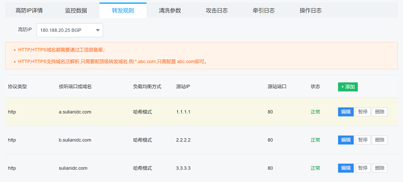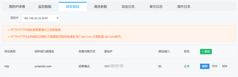 以下示例為將sulianidc.com及所有二級子域名的所有http流量轉(zhuǎn)移到源站103.*.*.*服務(wù)器的80端口(sulianidc.com等同于 *.sulianidc.com, 配置時省略星號)。