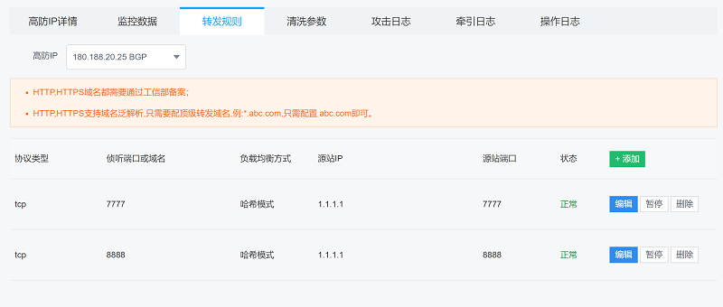 配置轉(zhuǎn)發(fā)規(guī)則的目的就是告訴高防IP,在哪個端口偵聽哪個協(xié)議的報文,然后將其對應(yīng)到哪臺服務(wù)器的哪個端口。